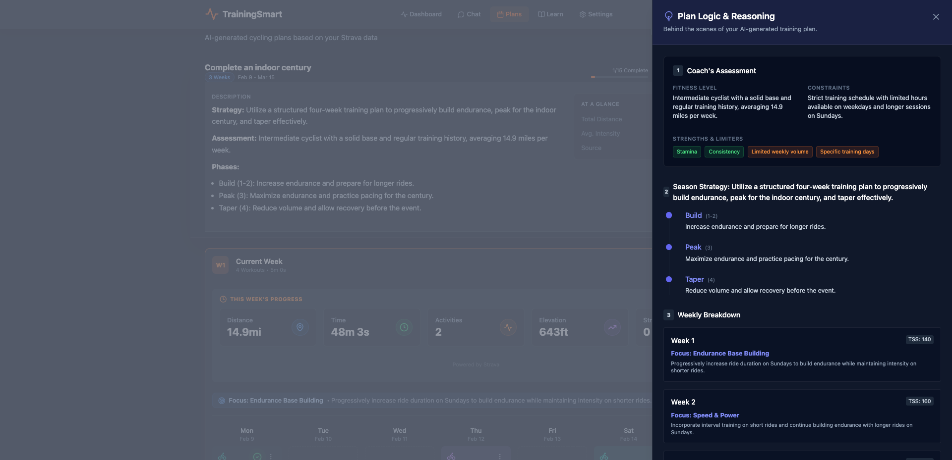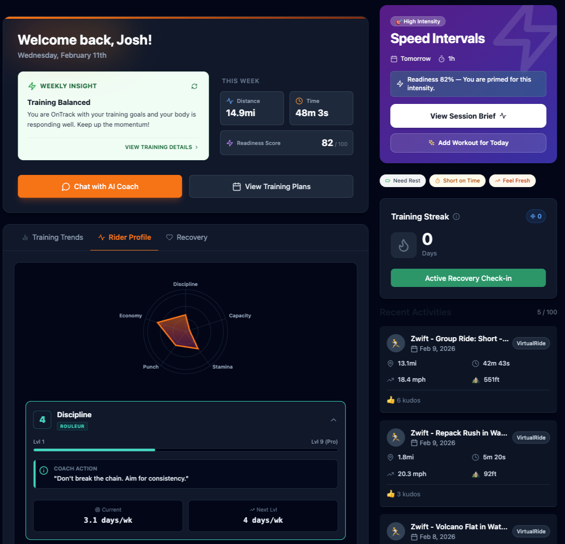 TrainingSmart integrates data from Strava, Oura, and more to deliver simple, science-backed recommendations — “what to do today” to build endurance, consistency, and speed safely.